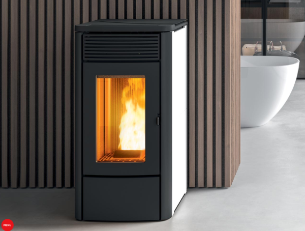 Stufa a pellet 6 kW, con struttura stagna e fianchi in ceramica, ideale per piccoli spazi o case ben isolate.