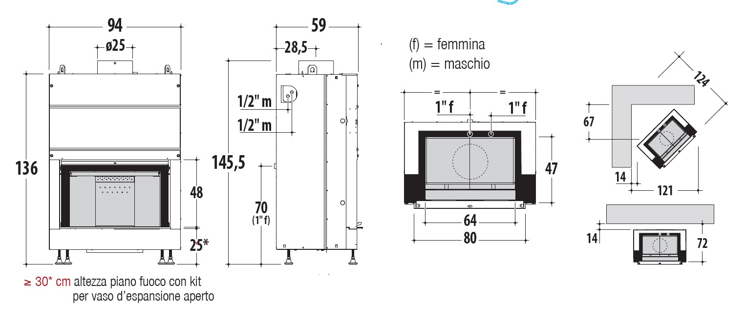 Termocamino a legna per riscaldare l’acqua, dalla connotazione moderna. Si distingue per la forma rettangolare della porta, interamente in vetro ceramico; apertura a saliscendi e a ribalta per la pulizia. Camera di combustione rivestita in CMtech®, refrattario realizzato con spessori importanti, deflettore in vermiculite. Opzionali i due accessori per il vaso d’espansione aperto e per vaso d’espansione chiuso.